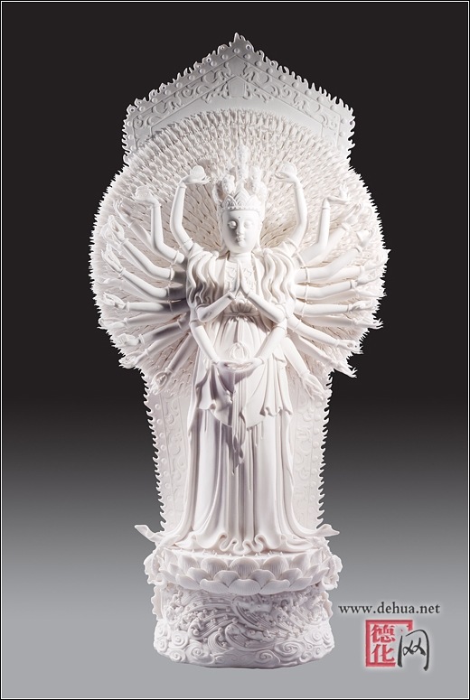 例如,陈仁海2006年创作的《千手观音》瓷雕,88厘米的观音,立于42厘米的莲座上,体态丰腴,百如满月,鼻梁隆起接额部,形成柳叶的弯眉。上下眼睑饱满,眼角下垂,千手栩栩如生,双耳几垂及肩,小口微含笑意。观音细发如丝,均根根到底,无一错乱。观音宝冠两侧各有一根飘带由肩垂下,与飘拂的长袖蜿蜒曲折至莲座,颇有“吴带当风”之韵。整座雕像精巧细致,神态如生,蕴含着高深莫测、令人肃然起敬的神秘感。此作品被故宫博物院陶瓷名家叶佩兰研究员赞赏为“天工造化,中华瑰宝”,是价值连城的永世珍宝。