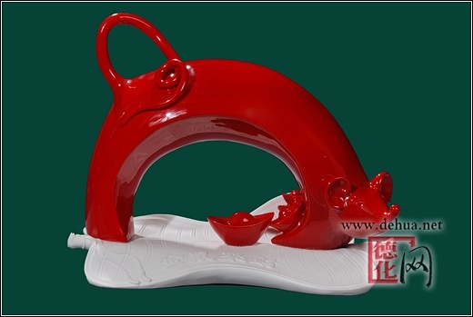 又例如:陈仁海设计制作的2008年鼠年纪念瓷,一款以端坐在似鸟巢又似元宝之上的“鼠击鼓而乐”为造型,通体洁白如玉,取名“子来福到”,名自《诗&S226;大雅&S226;灵台》:“经始勿亟,庶民子来”,谓民心归附,如子女趋事父母,不召自来,表达了全国上下万众一心,共建和谐社会的生动局面;一款以卡通红鼠聚财为造型,作品主体红如火焰,喜气洋洋,取名“金鼠聚财”,寓意人们财富增加,幸福安康。
