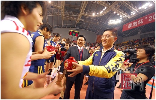 【德化网 讯】 2月25日、26日,在晋江和集美举行的两场2008中国女排国际对抗赛上,德化名瓷首次亮相国际女排赛场,卓越陶瓷有限公司成为晋江中古女排对抗赛协办单位和指定礼品,盛世·国宝“富贵红”成为集美赛事的战略合作伙伴和唯一指定礼品、奖杯。县领导涂健圻、黄国庆、林华武、黄耀昆、温文英等到集美赛场观看了比赛并为球员颁奖,“中国瓷都·德化”厦门富贵红营销中心组织员工组成近百人的拉拉队方阵高举盛世·国宝“富贵红”牌匾为中国女排呐喊助威。