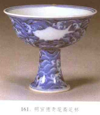杯式之—。撇口、弧腹,下承以高足若把柄,故俗称“把杯”。因执行手中便于在马上饮洒.又名“马上杯”。用于佛前供奉者,称“净水碗”。有陶、瓷质之分。陶质高足杯以龙山文化黑陶高足杯最为著名。瓷质高足杯始见于隋、唐、源于同时期的金银器。明显受到西亚文化的影响,后成为元、明、清时期流行的器形。景德镇窑、龙泉窑、德化窑、钧窑、磁州窑、耀州窑、霍县窑、介休窑等处都大量生产。元代的高足杯,垂腹多较浅,足高长,且有八方、转心、竹书柄各式。1980年江西高安窖藏出土的元代釉里红彩斑高足杯、杯底有上小下大的圆锥状榫嵌入圈足内,圈足上方有微内收的榫,能使杯旋转。明以后的高足杯增加菱花口式。(见图161)