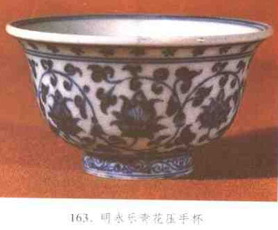 明代永乐朝景德镇御窑厂创制、为皇室内廷所垄断的—种杯式。器呈撇口、弧腹、圈足,足底外沿凸出一条棱线。手持时器口恰合于拇指指节,并因器壁自口沿而下胎体渐厚,托于手心有凝重之感,故名。明人谷应泰《博物要览》记载:“压手杯,坦口折腰、沙足滑底。中心画双狮滚球,球内篆大明永乐年制六字,或四字,细若粒米,此为上品,鸳鸯心者次之、花心者又其次也,杯外青花深翠,式样精妙、传世已久,价亦甚高。”压手杯因弥足珍贵,后世仿品甚多,传世真品寥寥,多为四字款识。(见图163)