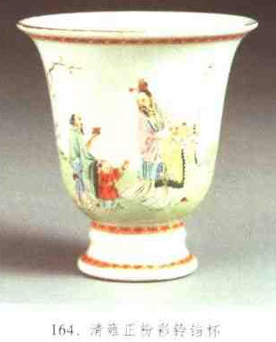 亦称仰钟杯、金钟杯、磬式杯、杯式之一,流行于明、清时期。杯口外撇、深腹、圈足,倒置似铃铛。明成化、嘉靖、万历时铃铛杯有白釉、斗彩、青花等品种。清康熙、雍正时则有青花、五彩等。(见图164)