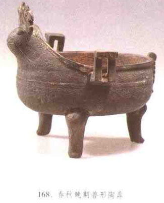 春秋、战国时期出现的鼎式之一,仿青铜礼器,陶或原始青瓷制品,江南地区出土较多。北京故宫博物院收藏的原始青瓷兽首三足鼎,器形为广口、窄沿、浅直腹、平底、兽蹄形三足。口沿—侧贴塑有直立的兽头,与之相对一侧贴短尾。兽首高昂,双目外突,额上有双角。在兽首与尾之间、有对称的长方形折边立式双耳。(见图168)