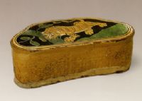 说 明: 深红褐色泥质细陶胎覆盖着白色化妆土,施三彩釉,有开片。