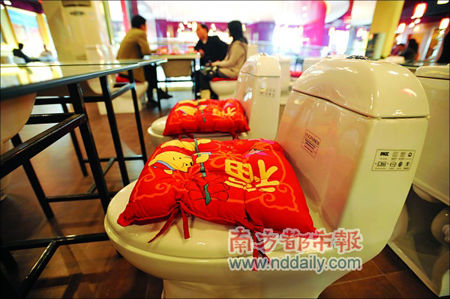 南方都市报3月6日报道 你愿意坐在马桶上就餐吗?你愿意把美味佳肴摆在浴缸上吗?昨日,佛山某卫浴公司新开的展厅标新立异,把展厅变成了餐厅,把马桶变成了餐椅,在浴缸上铺上一块玻璃变成餐桌。