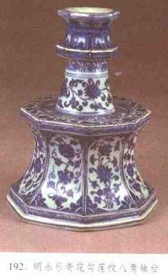 插置蜡烛的照明器具。三国时期有青瓷卧羊形烛台。西晋流行卧狮形烛台。南朝时烛台形式较多、有狮形、单管、双管、四管、荷花形等,其中管状烛台在福建地区流行,上有弦纹长柄,柄上端是敞口碗形,碗中有烛座。明永乐、宣德时景德镇窑烧制的烛台,器口和台座呈八角形,颈部为圆柱形。北京故宫博物院藏明正德官窑款青花阿拉伯文烛台,为一管状圆柱立于高台盘。清代以后的烛台形制基本承袭此式。(见图192)