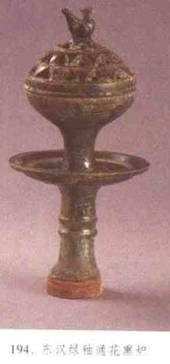 熏香用具。其历史十分悠久,湖南长沙汤家岭西汉张瑞君墓出土的铜质器上,就有“熏炉”二字铭文。三国、两晋时,贵族“无不熏衣剃面,傅粉施朱”。成为一时习俗,青瓷熏应运而生、并广为流行。其造型三国时多敛口、扁圆腹、圈足、索耳,器身遍布大小不一的镂孔,有的中心立—中段镂孔的细筒,以置香料;西晋时多为球形香笼,下连三熊足及浅腹平底承盘,环腹壁横列数层三角形气孔,直口边常堆塑飞鸟或圆珠;东晋器直口开阔,有的香熏呈上下开合式;并以支柱连接钵式承盘,平底无足。(见图194)