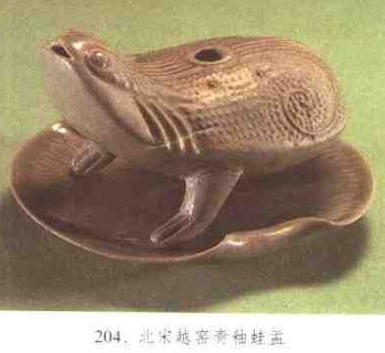 用于盛水的文房用具,形状似蛙,故名。流行于三国、两晋时期,以越窑青瓷制品为主。浙江上虞早期越窑地址中发现三国时期蛙形水孟,整体作蛙形,背负管状孟口,蛙头向前伸出。前足捧钵作饮水状,后足直立,蛙尾曳地,构成鼎立的三足。1955年江苏南京御道街太庙遗址西晋墓出土的蛙孟作蹲伏状、鼓目朝天,背部装有一个圆筒形口,用以灌水。腹部浑圆。东晋时的蛙孟、腹下部向内收敛,假圈足较高。1983年浙江慈溪文物部门征集的北宋越窑青釉蛙孟造型别致,三足蛙昂首立于荷叶之上,蛙背上有一注水圆孔。(见图204)