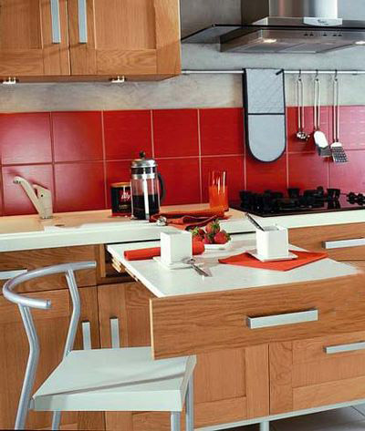 厨房内的必须品可依其使用频率分层置放,最常用者集中摆放在双眼至膝盖之间的范围,越少用到的物品便收纳在越高或越隐蔽的角落。