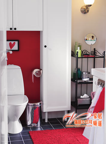 坐便器上方的吊柜,将小卫浴的立体空间利用了起来。旁边的不锈钢制桶收纳垃圾。白色的洁具与红色背墙以及地毯形成强烈对比,视觉上呈现小卫浴的完美空间。