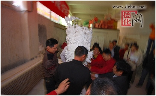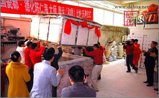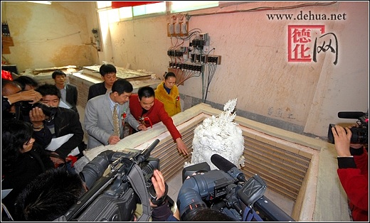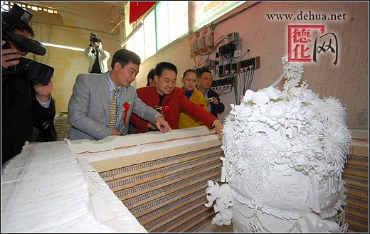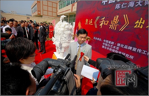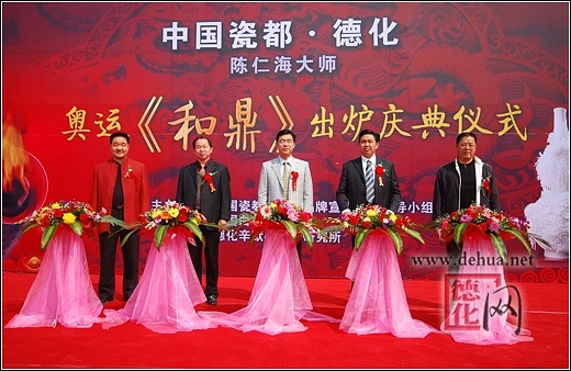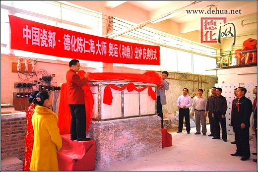 【德化网 讯】 2008年北京奥运会即将举行,举国欢庆,举世瞻目。3月6日,“千年一宝·奥运《和鼎》”出炉庆典仪式在中国瓷都德化隆重举行。这是德化陶瓷巨鼎的首次问世,也是对2008北京奥运会的又一次隆重献礼。德化县人民政府县长李辉跃,中共德化县委常委、宣传部长涂健圻及中国陶瓷工业协会副理事长黄发建、福建省陶瓷专业委员会秘书长张南章等领导嘉宾共同见证了这一历史性时刻。