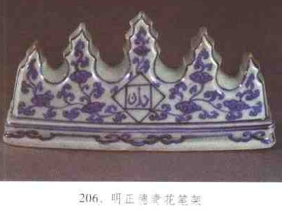 放置毛笔的文房用具,形如并列的山峰,故又称笔山。元、明时期流行。北京元大都遗址出土的青白釉笔架,镂雕成5座山峰形,山间浮云环绕,中间山峰上塑有朵云托日,山崖间布满藤蔓,青竹挺拔.山间溪流中浪花飞舞,游龙嬉戏。1984年景德镇御窑厂遗址出土了永乐釉里红梅竹纹笔盒,也有笔架功能,器形为长圆形、平底、盖与盒有子母口,盒内分成三格。正德时期的五峰山式笔架,下连须弥台座。绘缠枝灵芝纹,两面有菱形开光,内书波斯文“笔架”。万历朝笔架有长方形盒式。唇口沿外撇、四角内折、长圆形足、内有笔搁。有青花、五彩两种。清代笔架形状较为丰富,有盒式、山形和椭圆形数种。艺术水平超越前朝,如乾隆朝哥釉笔架。山峰做成玲珑透雕状,形似太湖石。(见图206)