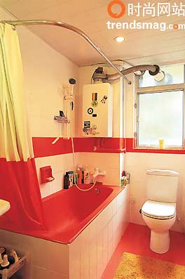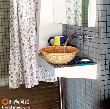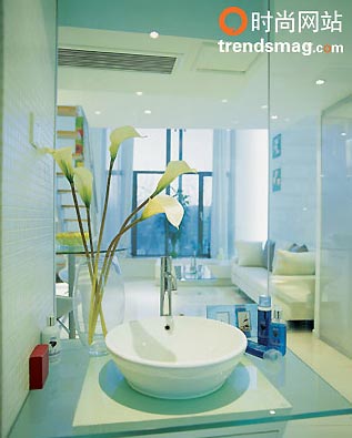 一眼看上去,整个浴室给人以个性而前卫的第一感觉,这恐怕要归功于一件件如同个性符号般的洁具、大面积铺贴能够形成条纹效果的马赛克、在洗面盆前设立矮墙及用灯衬托等有新意的物品和装修方法。