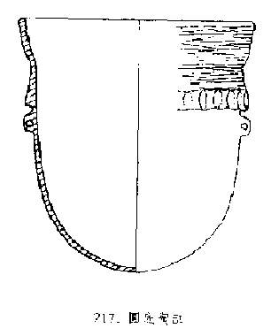 陶瓷容器底部形式之一,即圆弧形底,由器壁至底面作圆弧形过渡,无明显转折,底部无明确的平面。多见于早期陶器,新石器时代仰韶文化、马家窑文化均有圜底的钵、盆、罐等。后代瓷器偶见圜底造型、如唐代青釉或三彩圜底钵盂。(见图217)