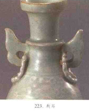 耳的一种式样,因形似古代兵器戟而得名,主要流行于明、清景德镇窑瓷器上,品种有青花、斗彩、仿官釉等;如明正德青花戟耳香炉、万历青花戟耳瓶、清雍正仿官釉戟耳瓶、嘉庆斗彩戟耳瓶等。(见图223)