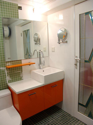为了贮存一些卫生用品,卫生间常常设置柜橱,或者在墙面上做壁柜。如果在柜橱或凹槽的门面上安装上镜面,不仅使卫生间空间更宽敞、明亮,而且豪华美观,费用也不贵,更可以与梳妆台结合起来,作为梳妆台镜使用。