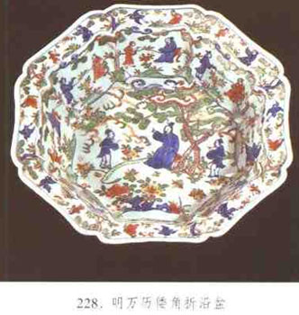 又作“委角”。方形瓷器转角的一种装饰形式,有几种样式:常见的是将直角变为内凹双弧线;或将直角变成圆角;也有的将直角斜削45度,变四方形为八角形。倭角常出现在方形盘、盒、瓶等器物上。(见图228)