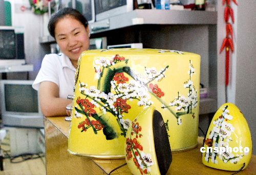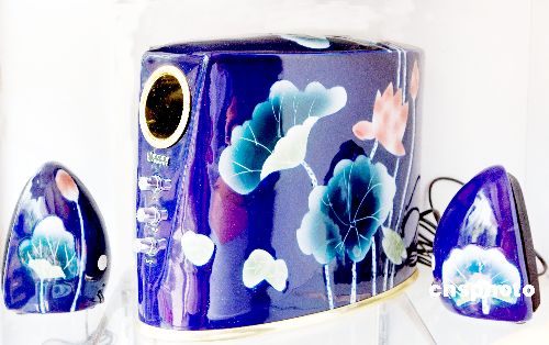 绘有国画图案的陶瓷箱体 6月9日,在安徽淮北市濉溪县某音响店,一款绘有荷花图案的陶瓷音响格外引人注目。据了解,这种音响以景德镇生产的陶瓷上面绘有各种国画图案做箱体,音质更加完美,受到不少音乐发烧友的青睐。