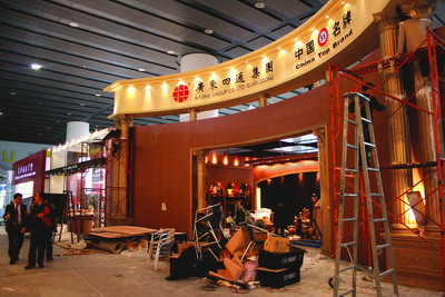 进入陶瓷展展厅,第一眼就能看到广东四通集团有限公司那最高大最富丽堂皇的展位。从3月17日早上到下午,四通的展位布展工作一刻都没有停止过。记者几次的采访要求,都被婉言谢绝。那么,就请跟随记者的目光,一同从视觉感官上来认识一下“四通”风采吧。