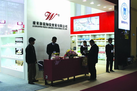 高档日用强化瓷和高档骨质瓷是广东伟业公司的拳头产品,也是国内同类型产品中质量最好的产品之一,一直畅销于海外,公司有多套瓷具曾囊括中国陶瓷产品设计大赛金银铜奖。在印有清绿莲蓬图案的纱帐环绕下,展厅里那些白如雪、细如丝、明如镜的枫溪瓷让人大开眼界,瓷具的色泽光感、款式造型,无不给人以视觉的享受。厅前摆置的茶水糖果,为“伟业”的亲和力加分不少。