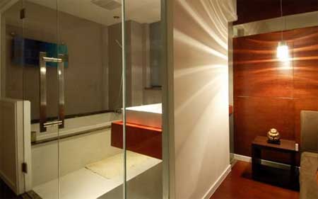 一些较前卫的人,希望将卧室、客厅、卫浴间打通,形成大空间的态势。若居住面积不大、空间小,就要设法通过设计来弥补视觉上的缺陷,使之在视觉上感到通透,于是开始有人把卫生间的门墙打掉,装上大面积的玻璃、玻璃砖,或采用镜面,营造出通体透明的卫浴空间。