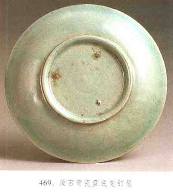 用支钉为间隔具装烧的陶瓷器釉面上留下的钉尖痕迹。支钉痕如果大或深,会严重影响产品的外观质量。因此,工匠们尽可能将钉尖部做小。北宋汝窑烧制的宫廷用瓷支钉细小,釉面上留下的支钉痕小如芝麻粒,被称为“芝麻挣钉”。(见图469)