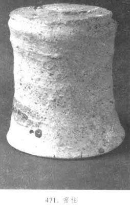 又称“支柱”或“垫柱”,是瓷器焙烧时支承装好坯件的匣钵和叠烧坯件的窑具。以耐火粘土制作。呈圆柱形、粗细、高度不一,下部直径略大于上部,实心或中心略空,颇坚实,有的表面留下螺旋沟痕,使用方法有二,一是有秩序地排列在窑床上、上面搭铺一层耐火砖,砖上叠摞匣钵;二是有规律地摆置在窑床上,每柱上直接承托叠烧的碗等坯件。窑柱在宋元时期北方地区使用较为普遍。装烧用窑柱、可使火焰与烟气畅流,还可以调节窑内温差,有利于瓷器的烧成。(见图471)