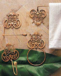 这一组铁艺毛巾架,给传统的直线条毛巾架带来设计理念上的冲击。由于铁艺制品本身的造型,使单一的墙面变得很有生机,而且采用了圆环、弯钩、横档等多种设计,可以满足不同的喜好。当然,尽管有一层漂亮的色彩涂层,铁艺在潮湿的环境下还是容易生锈,因此在考虑自家卫生间的通风与除湿条件,或者采用其他金属材料。