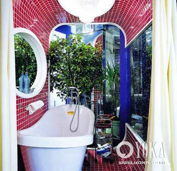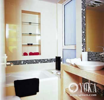 空间不大,也许可以说有点儿局促。但即使在这么个小小的角落,卫浴的主人都没忘了给环境打上“格子”。在柔和的主色调中,粗犷的蓝色瓷砖勾勒出几道轮廓,整个空间立刻显得整齐了很多。另外,黑色的浴巾和红色的毛巾球在背景色中非常醒目,给人眼前一亮的感觉。卫浴的主人不是一个可以忍受平庸的人,他喜欢通过小心思来创造生活的亮点。不要以为这种亮点仅限于视觉上的小小刺激,在索然无味的生活中,他会时不时创造些小惊喜。