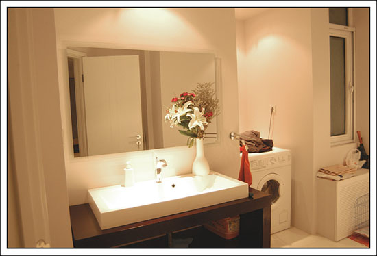 卫浴的色调以黑白灰为主。墙面灰色的亚光瓷砖中间,因为贴了一道西德石雕花墙砖,使单调的墙变得丰富起来,在整体视觉上让人感觉很舒服。