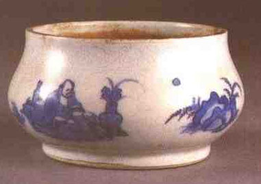 明代晚期天启至祟祯年间(1621~1644年)景德镇民窑生产的青花瓷器。万历四十八年(1620年)御窑厂停止生产以后,景德镇民间瓷窑仍很活跃、晚明青花大多数是民窑即不署年款的瓷器,有少数作品如“天启年制”款青花瓶等—类作品,可能是御窑厂的窑工还在继续生产,明朝社会动荡不已,官窑署款,民窑不署款的惯例有些并不严格遵守。当时社会各阶层对青花瓷器的需求量较大,瓷器外销也很活跃,官府限制松弛,从而使民间作坊得到发展生产的良机。晚明青花瓷器产量很大,青花钴料有3个来源:衢州、信州的浙科、江西上高的邑青和丰城的粗料。器物大多是日用品,少数是陈设艺术品。装饰花纹内容很多,减少了官窑器纯粹表达皇帝意志的规范图案,出现了活泼的草虫图如蟋蟀、飞蝶,各类动物纹如牛、羊、虎、猫、鱼、吓、鹦鹉、鹭鸶等,还有人物戏曲故事、山水景物、庭园小景等。这些画面多配以题画诗,绘画内容、意境和笔法与当时的文人水墨画风格一致,都着意表现士大夫阶层在政治上失意、寄情山水田园的隐逸思想。由于广泛采取分水和晕染技法,多有大写意的情趣,面面开阔,笔意潇洒酣畅,钴料虽粗,着笔不多,但艺术效果不凡,有些绘画笔法,如用青花点染太阳,具有明显的时代特征。晚明青花艺术风格的渐变,为清代青花瓷的勃兴奠定了基础。流传到日本的“古染村”、“祥瑞”瓷,以及远销欧亚各国的“芙蓉手”,很多都是晚明天启、崇祯年间景德镇生产的。(见下图)