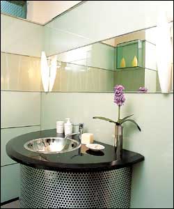 整体风格:因为卫生间本身不大,所以这套卫生间的墙面采用了高反光的玻璃材质,地面也用了高抛光的瓷砖,配合以明亮的灯光,卫生间看起来大了不少。不锈钢的面盆、龙头、透明的淋浴间使整个卫生间极富现代感。