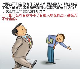 “那些不知道你有什么缺点和弱点的人,那些知道了你的缺点和弱点却要利用你谋取不正当利益的人,怎么可以当你的副手呢?”--把不会补台或被不了台的人放在身边,是极其不恰当的。