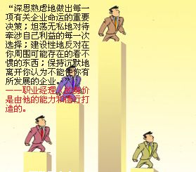 “深思熟虑地做出每一项有关企业命运的重要决策;坦荡无私地对待牵涉自己利益的每一次选择;建设性地反对在你周围可能存在的看不惯的东西;保持沉默地离开你认为不能使你有所发展的企业。”--职业经理人的身价是由他的能力和德行打造的。