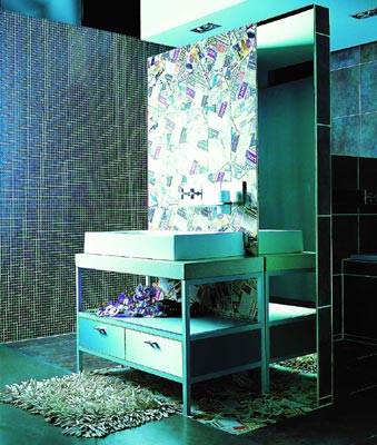 如果你的墙面底色较深就运用博洛尼最大胆goodfeel的POP花色瓷砖作为主题墙装饰墙面吧。让报纸堆砌出的亮丽色彩大面积装饰,拼贴的效果会使浴室设计看起来更加大气,配上熠熠生辉拉丝铝浴室家具和亮面镜子绝对拉风。张扬的创意是时尚年轻人不二的选择。