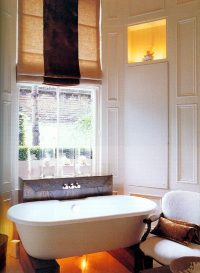 不少年轻白领喜欢把欧式带立脚的浴缸摆在主人房——甚至客厅里,觉得很时尚。这种仿古浴缸有的为平口,有的是斜口。斜口17173的浴缸高口部分便于靠背,使沐浴的惬意感加深。但是,仿古浴缸并不是所有的卫生间都可以安装的,它需要有较大的空间,如果要追求更多的情调,这类浴缸最好不要紧靠墙壁,至少留有20到30厘米的余地,可适当装饰一点罗曼蒂克的东西,像烛台什么的,就是窗帘的位置也需要考虑好,半遮半掩的诱惑性最强。
