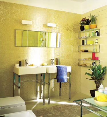 没有做任何复杂的布置,只在一面墙上贴满金色的马赛克,便令这个平凡的卫生间即刻具有了独特的个性和与众不同的空间感受。整面墙的金色马赛克反射着光线,让卫生间四周熠熠生辉,实现了年轻人大胆而张扬的想法,而要让卫生间的环境更有亲和力,不要忘了摆放些绿色的小盆栽。