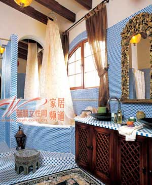 精心拼贴的蓝色瓷砖从墙壁一直延伸到地面上,体现出波斯风格偏爱大面积色彩装饰的特点。拱形结构在不大的空间里反复出现,这种形式,正是波斯风格的典型特征。确定了整体基调后,细节也不能忽略:洗手池下的储物柜门板上的方格,浴室的地面铺上色泽淡雅的厚剪绒毯,浴缸旁边的八角铜凳,既是精美的摆设也是实用的家什。