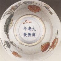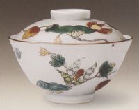 说 明: 此器盖口小于碗口,是康熙时期的创新器型,以后各朝均有烧制.此外,于豆青釉上描绘五彩纹饰,亦属创新之举.