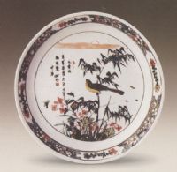 说 明: 此盘装饰上突出用黑彩,红、黄、绿、紫作点缀,构图舒展,笔法率意,色彩绚丽,诗与画相配,相得益彰.