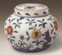 说 明: 此罐是以明代成化斗彩花蝶纹罐为蓝本仿烧而成.
