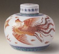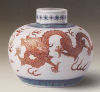说 明: 此器以斗彩作辅助纹饰,衬托矾红彩龙凤主题纹饰,产生特殊的艺术效果,是康熙斗彩瓷器中综合装饰技法的具体体现.