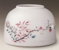 说 明: 康熙时期瓷质水丞形式多样,这种马蹄式水丞中使用粉彩装饰者颇为少见.