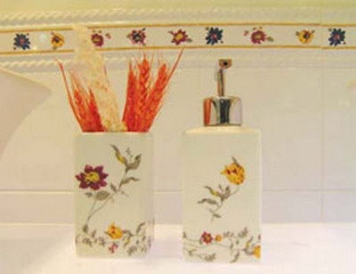 肥皂碟、牙刷杯等洗漱用品可以变成艺术品?你难以想象。然而,设计师就有足够的想像力将它们演绎成陶瓷艺术品。肥皂碟呈现一个小小的扁圆形,有意思的是位于扁圆形中央的图案设计———一张自然摊开的红枫叶,看上去就像秋天枫树上不经意间落下的一片枫叶,悄悄地在一个陶瓷小碗上安了家。枫叶的红,陶瓷制品的晶莹剔透,两者融合在一起,确实给予卫生间一种别样的美感。