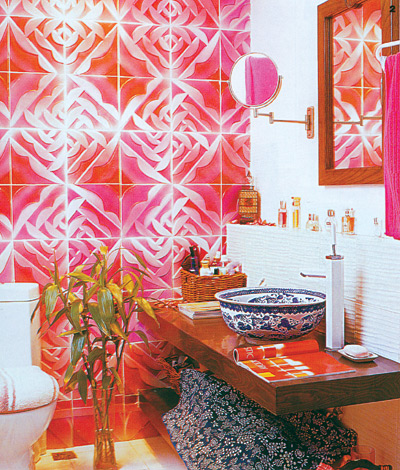 仿古地砖脚感一般都很舒适,踩上去有踏实、温暖、放松的感觉,突破了瓷砖脚感不如木地板的传统。大红玫瑰花朵图案的洗手盆把夏日的热烈奔放带进卫浴空间,古典中带着几许浪漫。