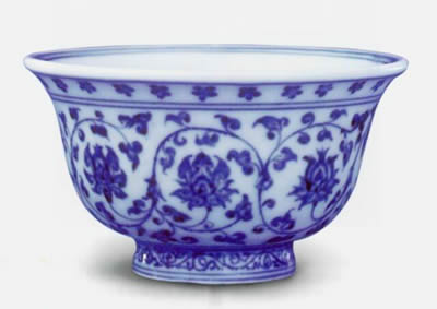 此杯为传世品,系一件明代景德镇窑烧制的著名青花酒杯,为永乐年间造。敞口,口沿外侈,深腹曲壁,下腹部微折,矮圈足。杯腹内外皆饰青花缠枝莲纹,口部饰朵梅纹,内底绘双狮戏球,球心篆书“永乐年制”题款。此杯制作精细规整,造型古朴敦厚,装饰构图匀称,画笔清秀流畅,色泽深翠凝重,是永乐年间压手杯之精品。