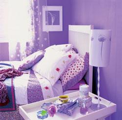 卧室里用了淡紫色的色调,强化了浪漫的情致。卧室和客厅的家具用了统一的造型和色调:白色的直线条的床,简单的白色床头柜,还有纤细优雅的台灯。卧室的必备家具搭配有粉色和红色花朵的软性饰品:窗帘和靠枕、被罩。一间适合年轻夫妇的浪漫卧室就这样布置出来了。