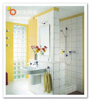 小空间虽然不必追求奢华,但同样需要在达到基本要求的同时,完成审美上的情趣。就算卫浴间的面积不是很大,也可以设计得非常别致。巧妙地应用隔断将盥洗区与淋浴区分开,充分展示了卫生间的整洁有序,在空间运用上更显得灵活而紧凑;木质防水地板的应用体现了整个卫生间的自然、大方;色彩仍然以纯净为主调,大面积地运用白色和柠檬色,看上去干净而富有朝气。