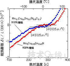 Mn3XN具有“反钙钛矿结构”(图1),在室温下具有很强的热负膨胀性。具有负膨胀性的Mn3XN通过改变构成元素以及比例,可以作为单一构成物质控制热膨胀特性。比如通过将位于Mn3XN的X位置的部分Cu和Zn置换成Ge和Sn,可以将磁性转移温度下产生的非连续体积缩小变成在100度的温度变化范围内的缓慢负膨胀。