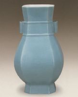 说 明: 此瓶仿制西周时青铜壶的造型,于朴拙大方中见隽秀雅典,既有古韵又因其釉色而平添了新姿,堪称难得.